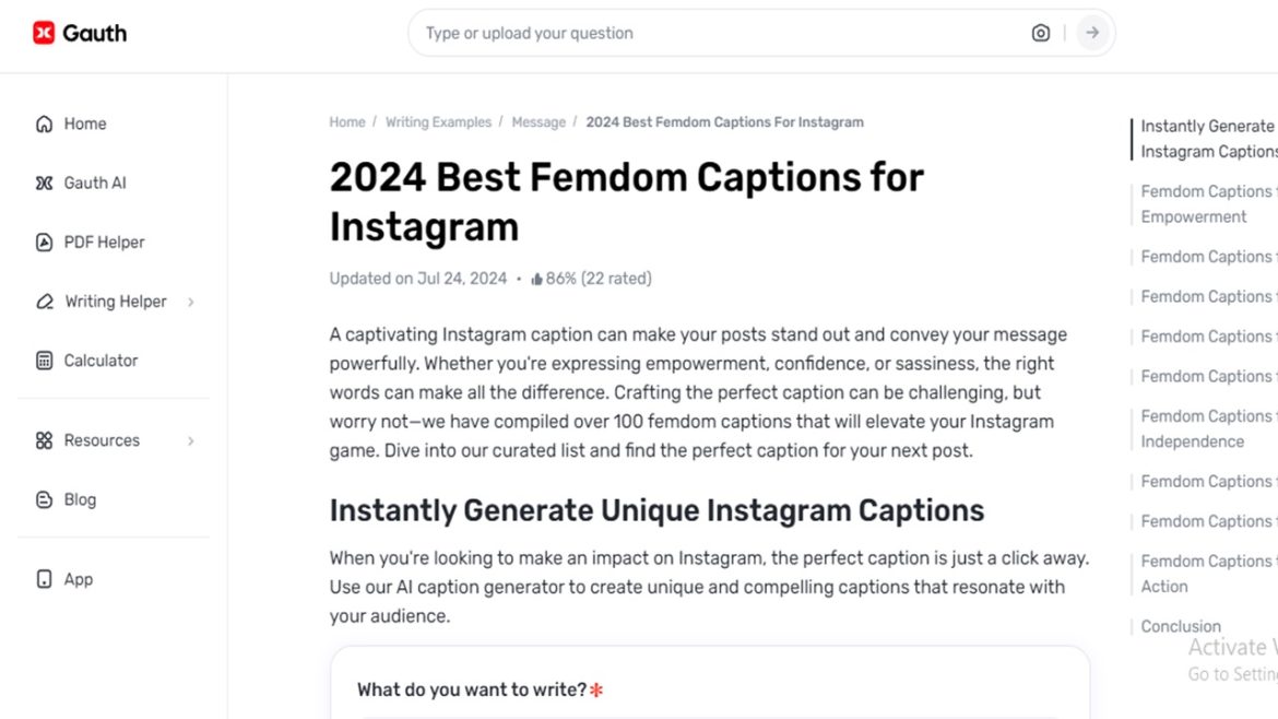 Gauth has evolved from just a Sass tool to a highly developed AI generation technology, which is a major improvement for minuscule categories such as femdom. Thus, by using the most up-to-date artificial intelligence and personalization and relevance factors, Gauth improves the process of creating stimulating femdom captions. No matter the goal, whether it is to say ‘I’m in charge,’ ‘I am powerful,’ or ‘This is who I am,’ Gauth gives you the means to write captions that are to the point, memorable and potent to the target audience. To improve the presence on social platforms and convey a strong message within the femdom community, embrace the capabilities of Gauth.